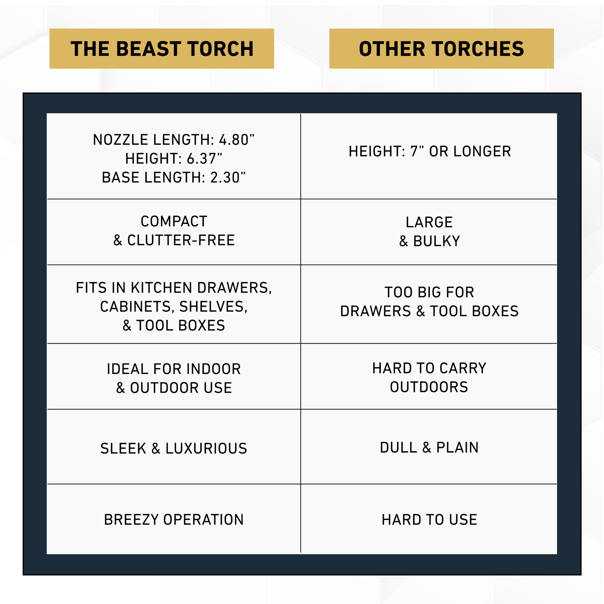 - Strong as Fire, Fierce as a Flame: Well built using durable kirksite and zinc alloy, our hand torch for cooking and crafting is made for every day, heavy-duty use. It also boasts a compact design, so you can easily store it in your drawer or tool box.