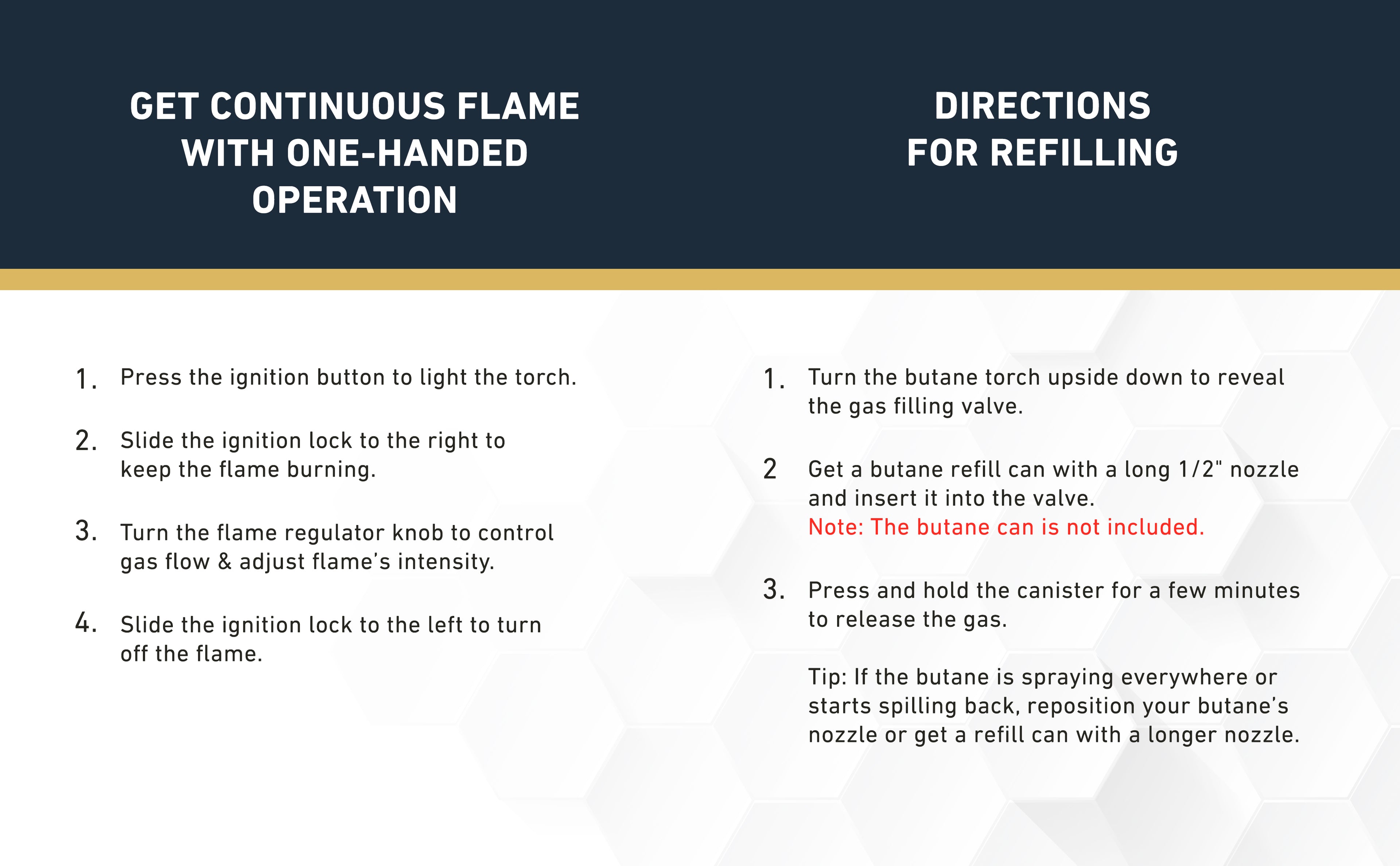 - Enjoy Easy One-Hand Operation: Master your craft with a versatile hand held torch. Our blow torch features an ignition lock that provides chefs, bartenders, artists, jewelers, and DIYers a strong continuous flame.